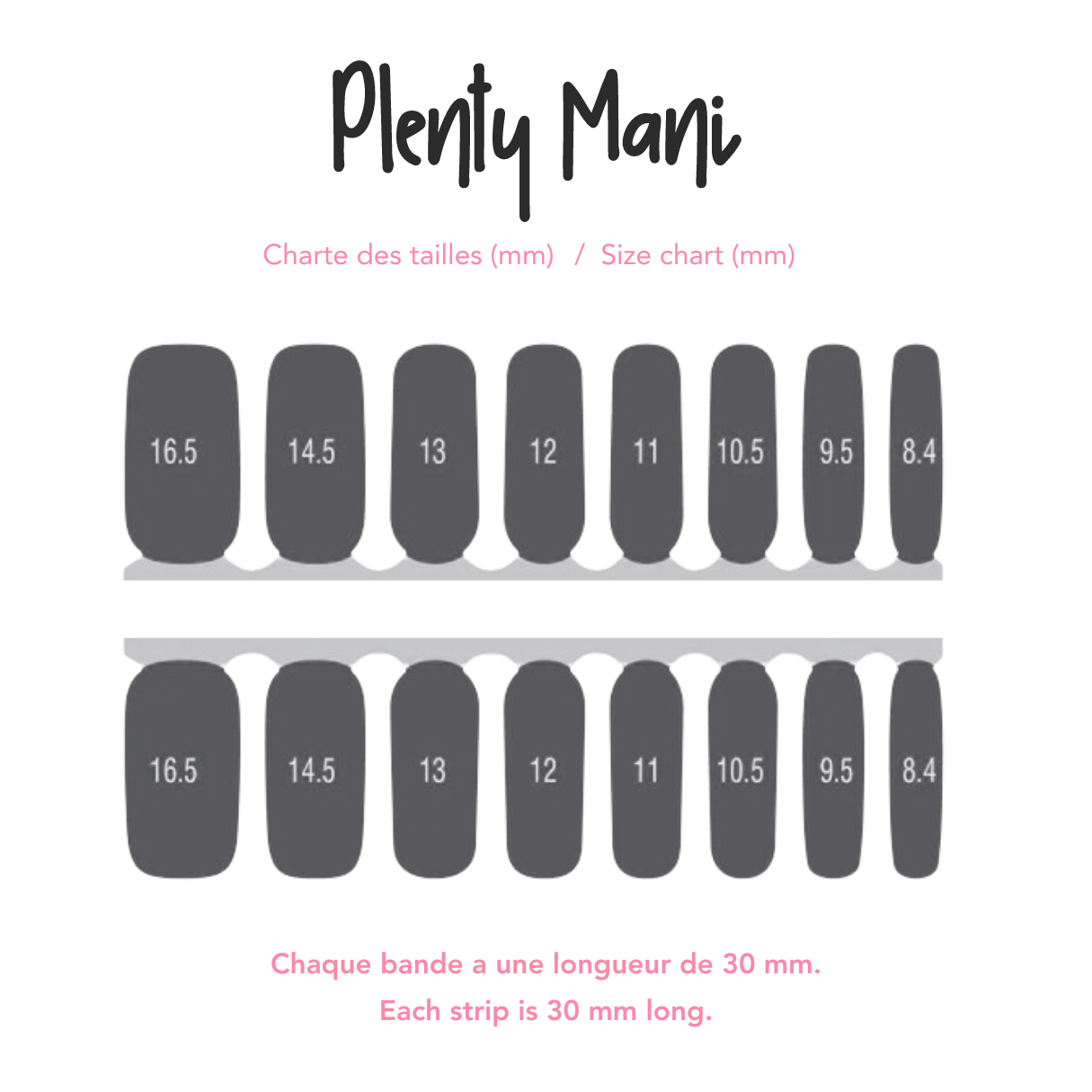 Chaque kit comprend 16 bandes de 8 tailles différentes, soit assez pour une manucure complète (deux si vos ongles sont courts)!